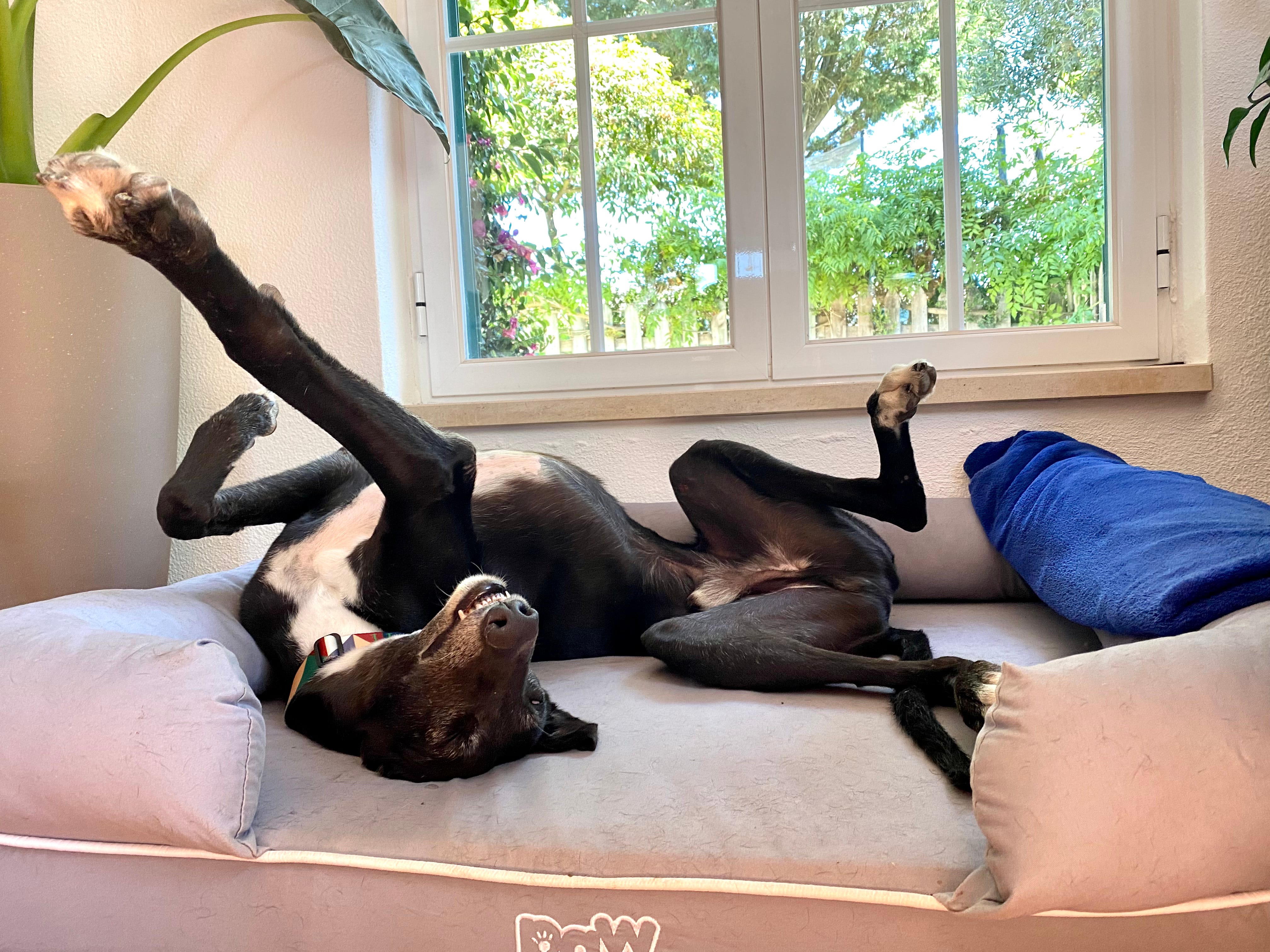 It's called roaching, apparently, and it’s a thing greyhound and greyhound-adjacent dogs do—the sleeping with legs akimbo thing, not the gross dating thing (don’t google it).